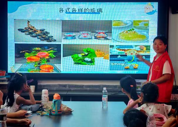 课堂上,志愿者们化身“非遗故事家”,一个个古老而神奇的故事娓娓道来,将琉璃如何从不起眼的砂石,历经烈焰淬炼蜕变为流光溢彩艺术品的传奇历程铺展在孩子面前。最令孩子们雀跃的当属“巧手复刻琉璃花”环节。七彩的扭扭棒在稚嫩的小手中弯折、缠绕,渐渐化作一朵朵独一无二的“琉璃花”,绚烂的“花瓣”在阳光下折射出斑斓色彩。在孩子们清脆的笑声里,蕴藏着对传统匠心的初识与向往。