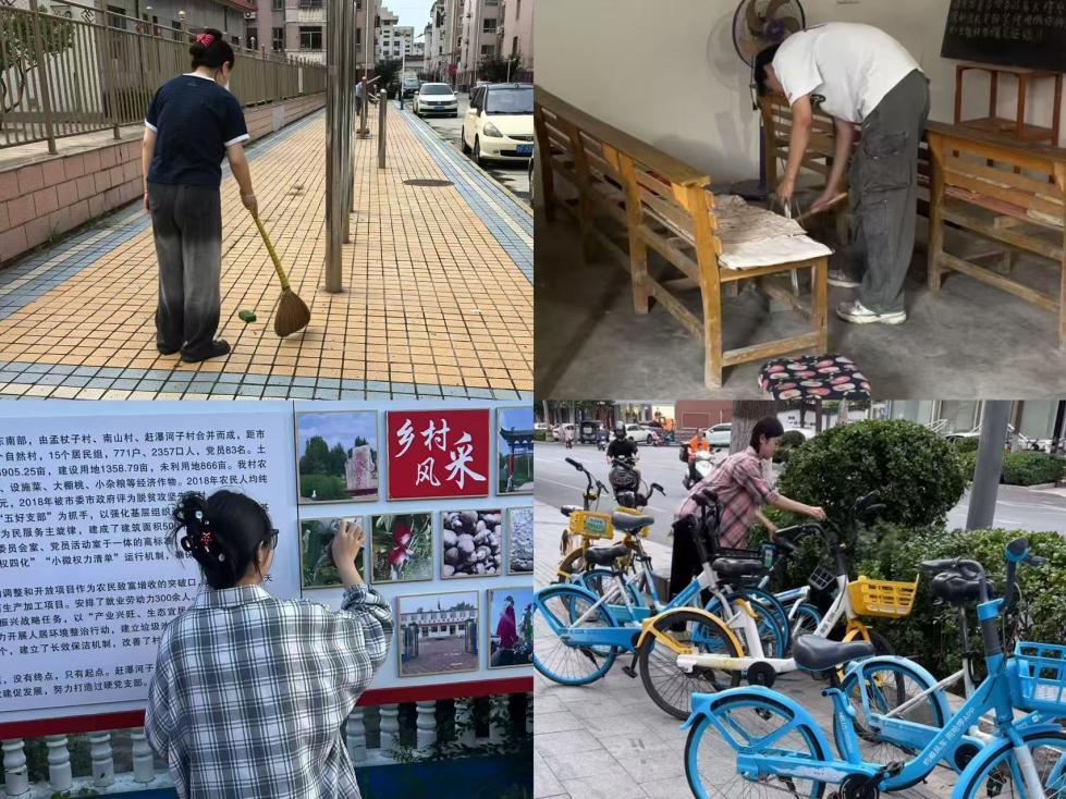 活动现场,学生们分工明确、干劲十足。清扫路面时,重点对落叶、烟头及缝隙碎屑进行“地毯式”清理,让道路恢复整洁,还深入公共区域,仔细擦拭休闲长椅、规整共享单车,为居民打造舒适休闲空间,也进行了社区宣传栏的清理工作,擦拭灰尘、维护展示内容,让“乡村风采”更好传递乡土温度 。