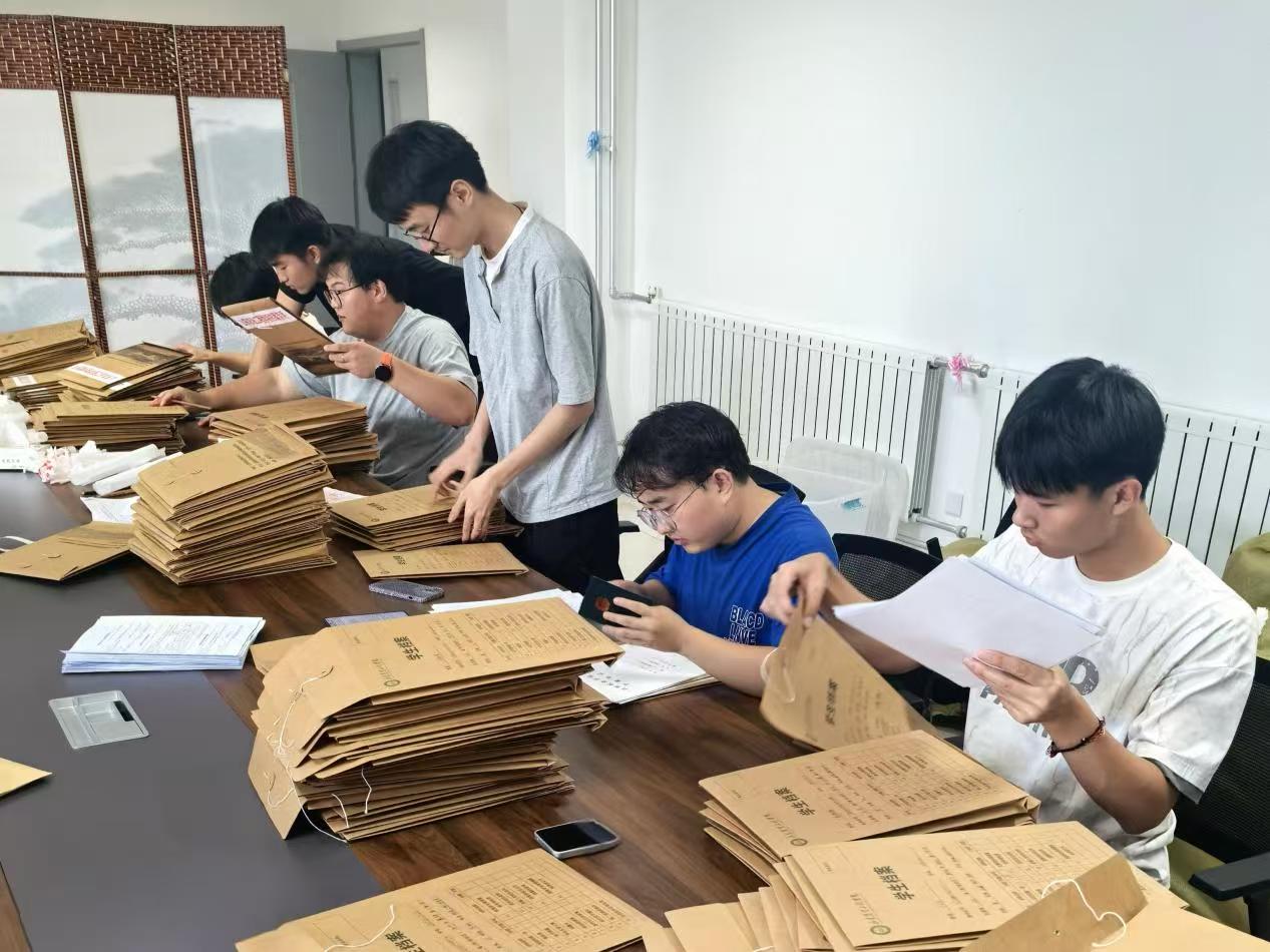 志愿者们对照清单仔细核查档案,确保材料无误、齐全。接着,他们按流程贴好封条、盖好印章,逐份贴上快递单、写下编号。整个过程中,大家态度认真,细心严谨,每一步都做得细致规范,全力保障档案顺利寄送。