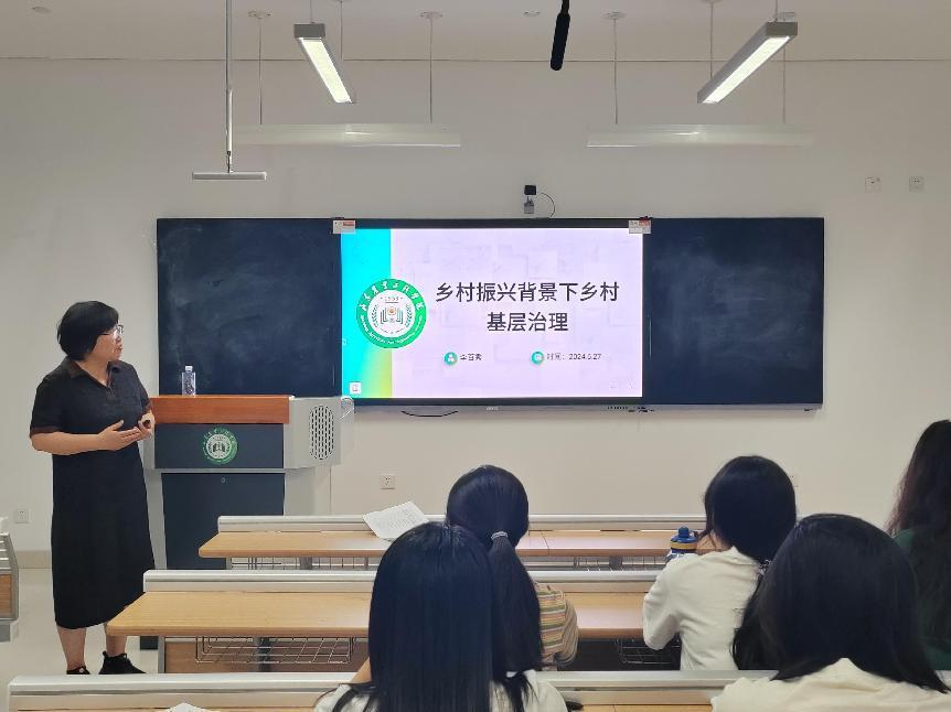 李百秀从乡村振兴目标要求谈起乡村基层治理是乡村振兴的根基。她向同学们详细解读了《关于加强和改进乡村治理的指导意见》中提出的2个总要求,17项具体任务和4项组织实施原则;介绍了《关于加强和改进乡村治理的指导意见》20条的具体内容。随后,她从党建引领、治理重点、主体内生力、外来资源助力等方面与在座的各位同学探讨了乡村基层治理的有效路径并分享了乡村基层治理典型案例。