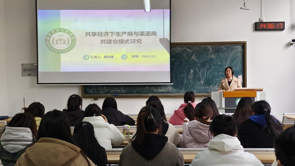 2024年12月2日下午,经纬讲坛第一百一十讲——《共享经济下生产商与渠道商共建仓模式研究》在淄博校区淄公南楼B112教室开讲,由经济管理学院陈岱莲老师担任主讲人,我院物流工程专业的学生及部分老师聆听了讲座。