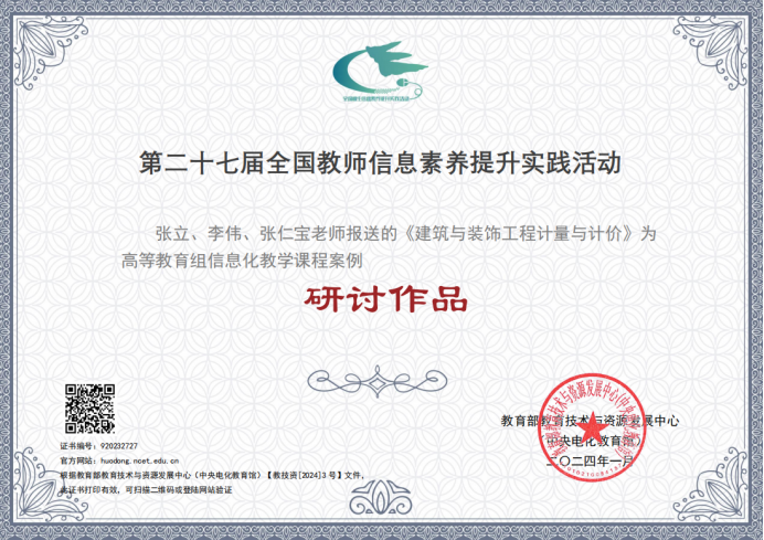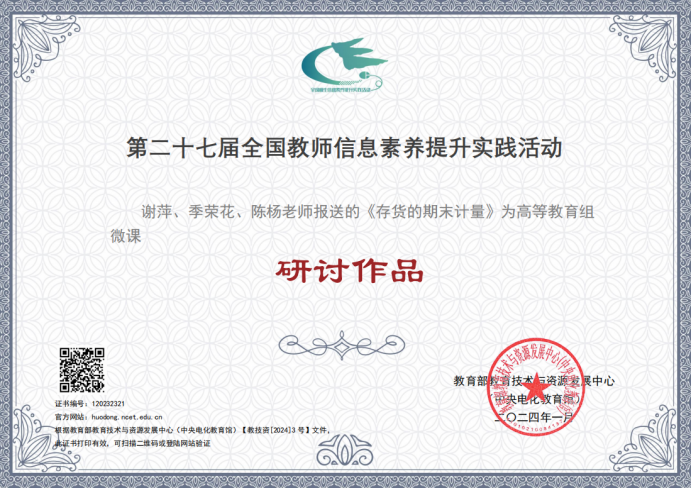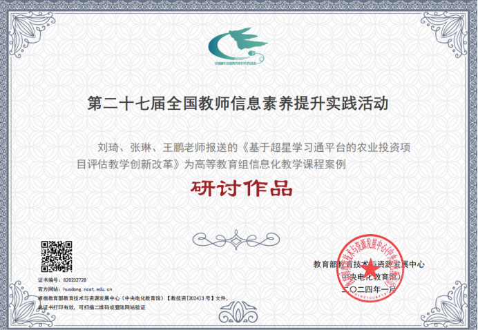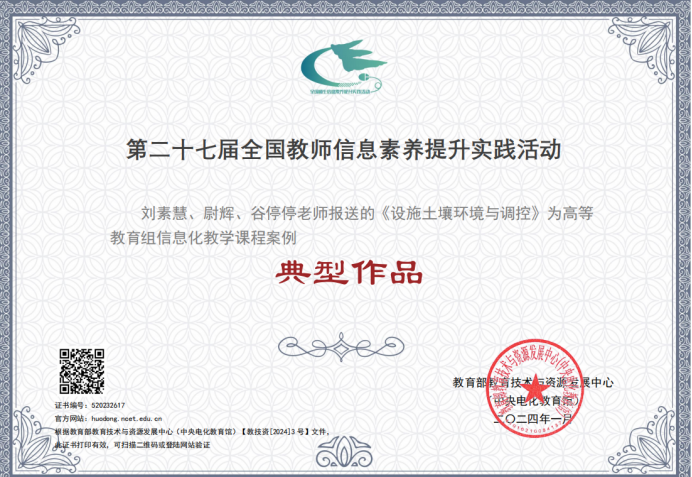 近期,教育部教育技术与资源发展中心(中央电化教育馆)公布了2023年全国教师信息素养提升实践活动(第二十七届教师活动)获奖名单,其中bat365刘素慧老师的《设施土壤环境与调控》获典型作品证书,谢萍老师的《存货的期末计量》、张立老师的《建筑与装饰工程计量与计价》、刘琦老师的《基于超星学习通平台的农业投资项目评估教学创新改革》获研讨作品证书。