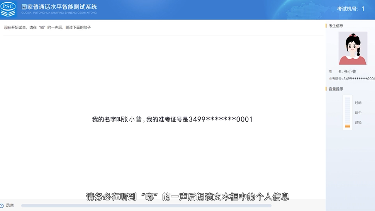 进入试音页面后,应试人会听到系统的提示语“现在开始试音”,听到提示语“嘟”声后朗读文本框中的个人信息。提示语结束后,以适中的音量和语速朗读文本框中的试音文字。