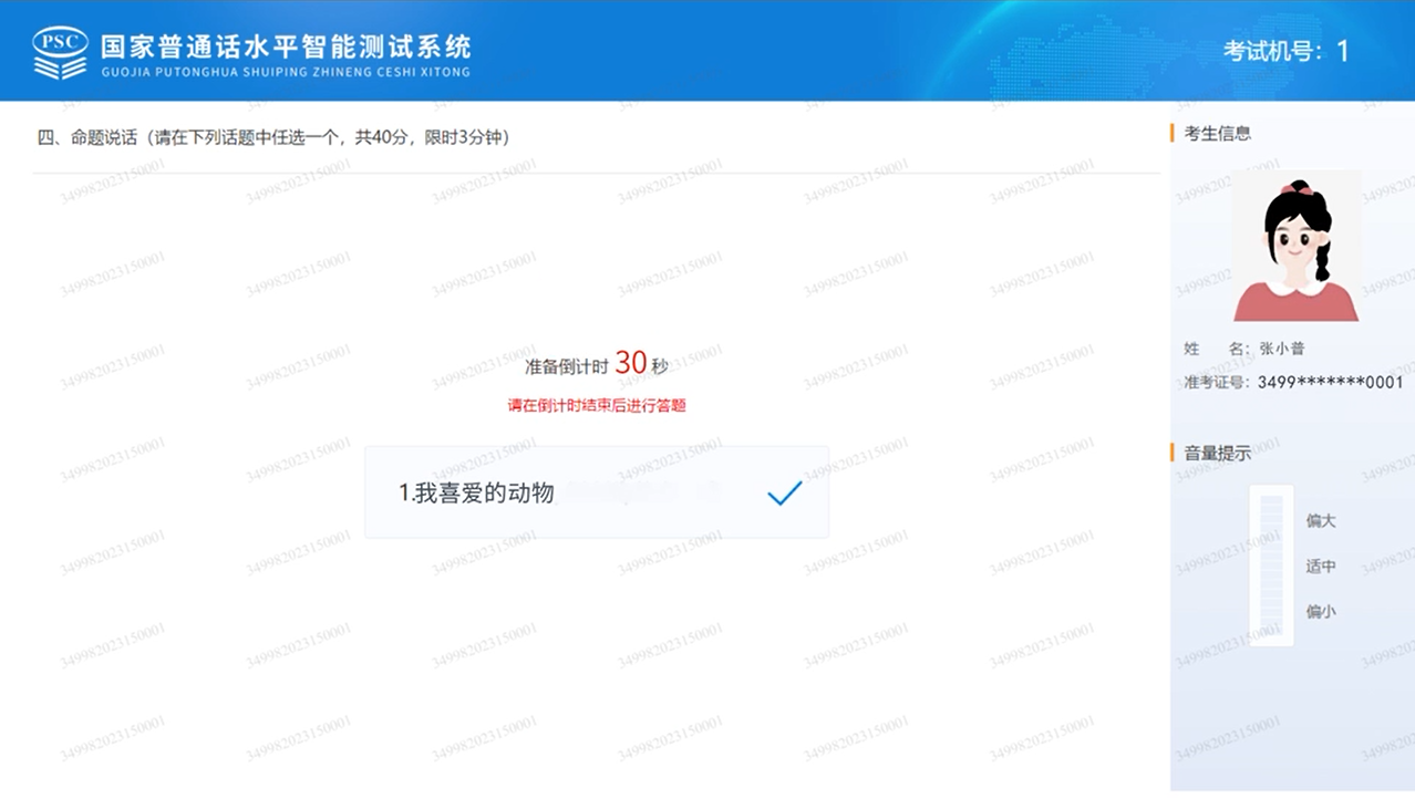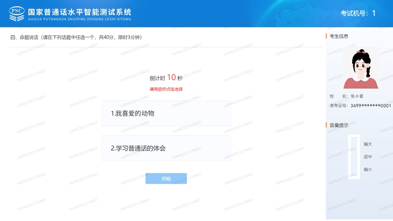 1.应试人按照电脑页面提示,在倒计时10秒内使用鼠标点击选择说话的题目,否则系统默认为第一个话题。确认题目后,应试人有30秒的准备时间,听到“嘟”的一声后,开始答题。答题时请先读出你所选择的题目。