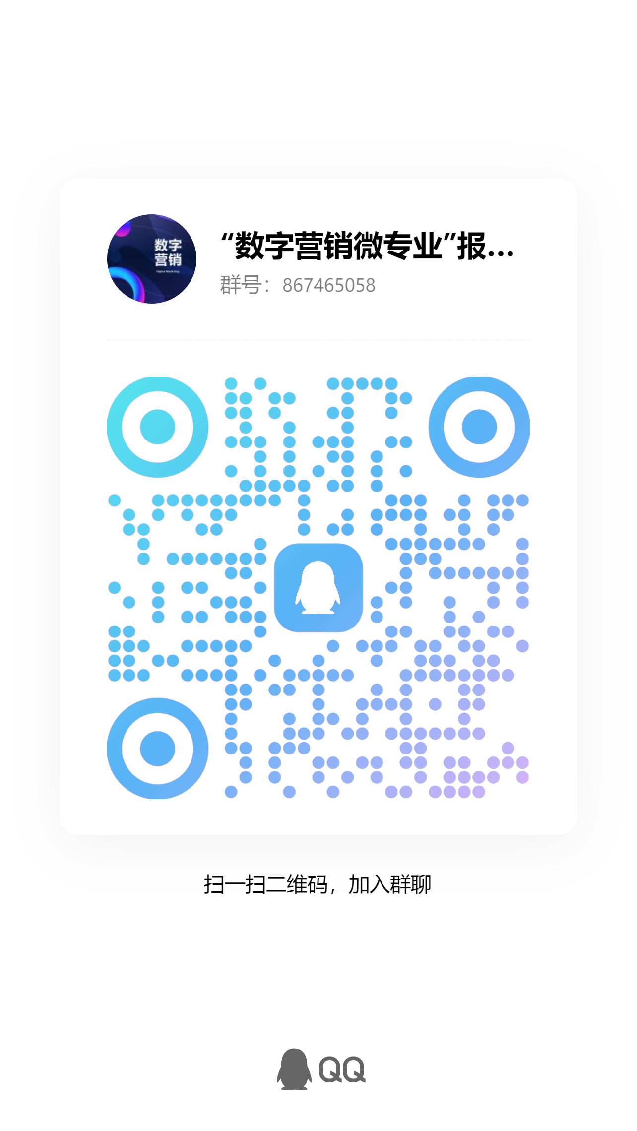 请拟报名学生以“学院+姓名+学号”实名加入“数字营销微专业”报名咨询QQ群:867465058,相关事宜将在群内通知。