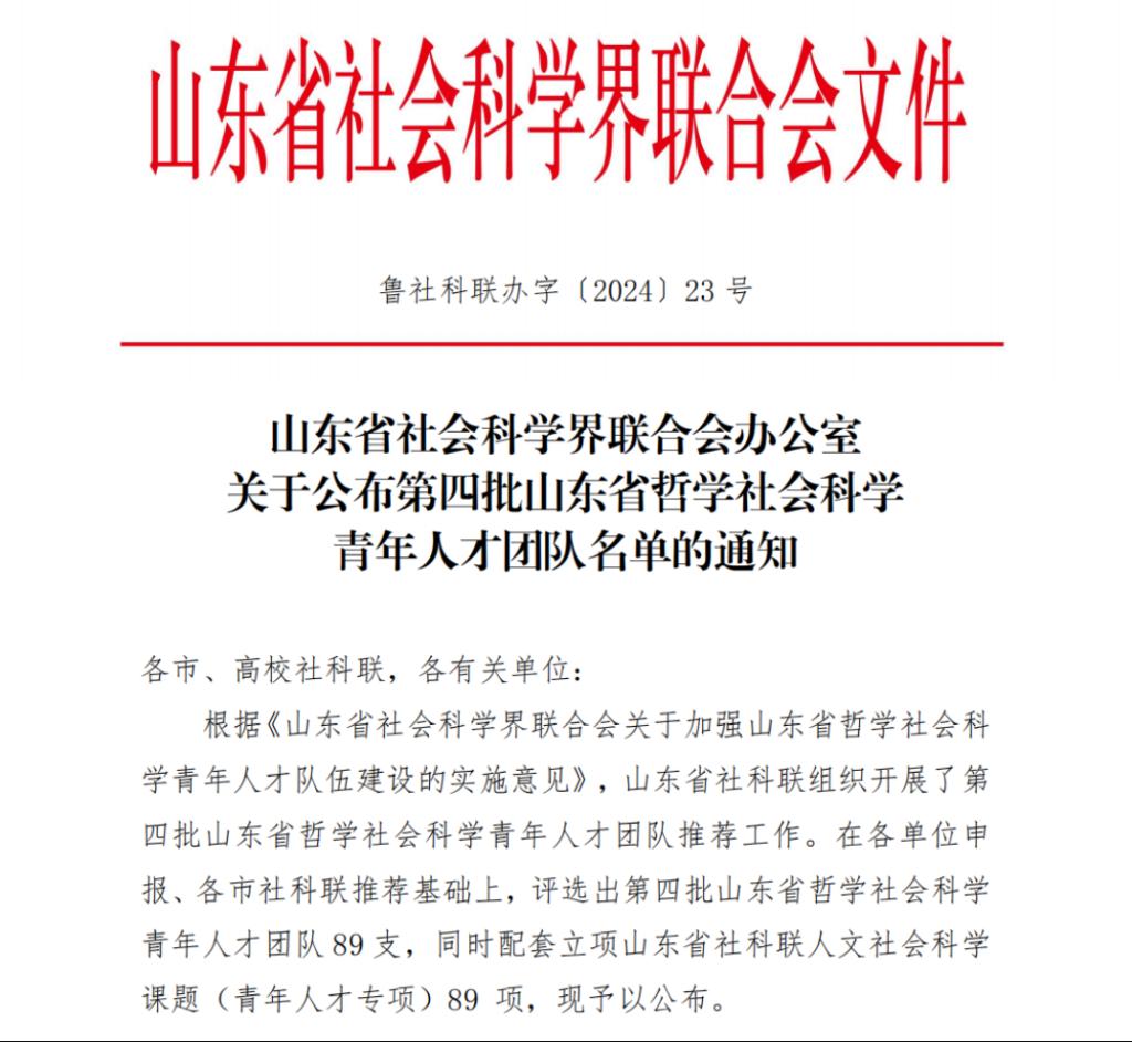 “第四批山东省哲学社会科学青年人才团队”由山东省社会科学界联合会立项,旨在认真贯彻党的二十大和二十届二中全会精神,深入落实习近平总书记关于哲学社会科学重要论述,助力培育壮大全省社会科学人才队伍建设,着力为推动青年人才成长成才创造条件。