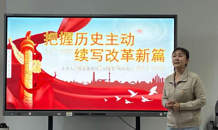 杨玖庆以深入学习贯彻党的二十届三中全会精神和《中共中央关于进一步全面深化改革、推进中国式现代化的决定》为切入点,结合学校建校以来的发展历程和近期推出的各项改革举措,分三个方面进行了讲授。一是把握历史主动,深刻领会新中国成立以来取得的伟大成就和奋斗精神;二是锚定关键领域,全力以赴攻坚克难,确保目标圆满完成;三是继续深化改革,持之以恒推进各项改革措施,确保改革取得实质性进展和长久成效。她指出,学校从以前的干部教育,发展到专科教育,再到现在的本科教育,是历届校党委班子领导全校职工,顺应历史潮流趋势、把握历史机遇、不断深化改革、持续拼搏奋进取得的显著成绩和突破性进展。