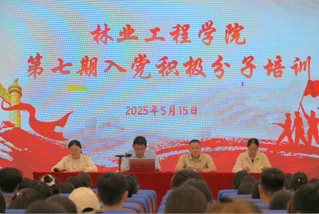 为端正入党动机,坚定信仰、增强党性、提高素质,2025年5月15日,林业工程学院“淬炼初心,启新笃行--第七期入党积极分子培训班”开班仪式暨开班第一讲在文法东楼报告厅召开。学院党总支书记赵阳、学生第一党支部书记张振、第二党支部书记刘延姣及172名入党积极分子参加专题教育,仪式由学院组织员乔游子主持。