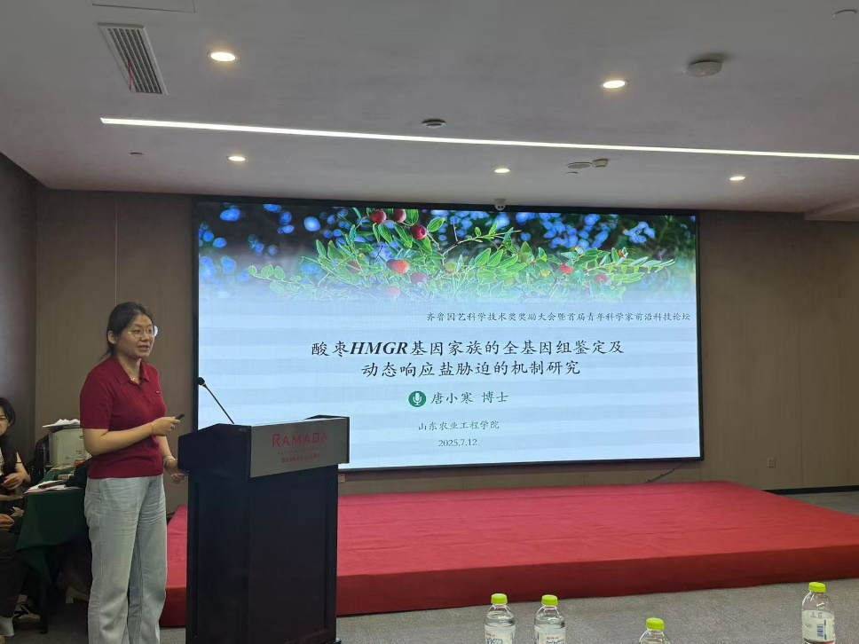 与此同时,我院青年教师唐小寒博士作为青年学者代表,在论坛上发表了题为《酸枣HMGR 基因家族的全基因组鉴定及其动态响应盐胁迫的机制研究》的专题学术报告。报告深入系统地阐述了团队在酸枣抗逆分子机制研究领域所取得的一系列重要成果,为深入解析园艺作物酸枣的抗逆机理开辟了全新视角,为盐碱地园艺产业的可持续发展提供了坚实的理论支撑。其前沿性的观点和详实的研究数据引起了参会专家和同行的热烈反响,赢得了高度认可与广泛关注。