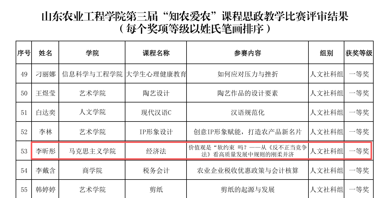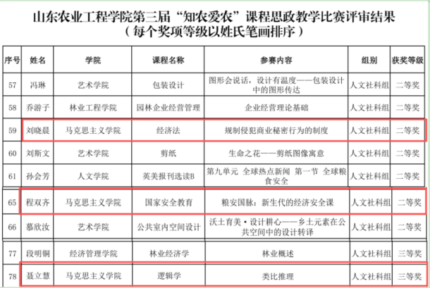 近日,学校公布了第三届“知农爱农”课程思政教学比赛评审结果,我院教师凭借出色表现斩获优秀成绩,李昕彤老师荣获一等奖,刘晓晨、程双齐老师荣获二等奖,聂立慧老师获得三等奖。