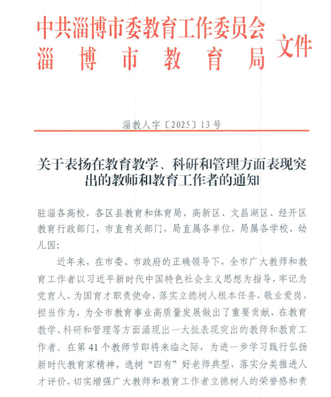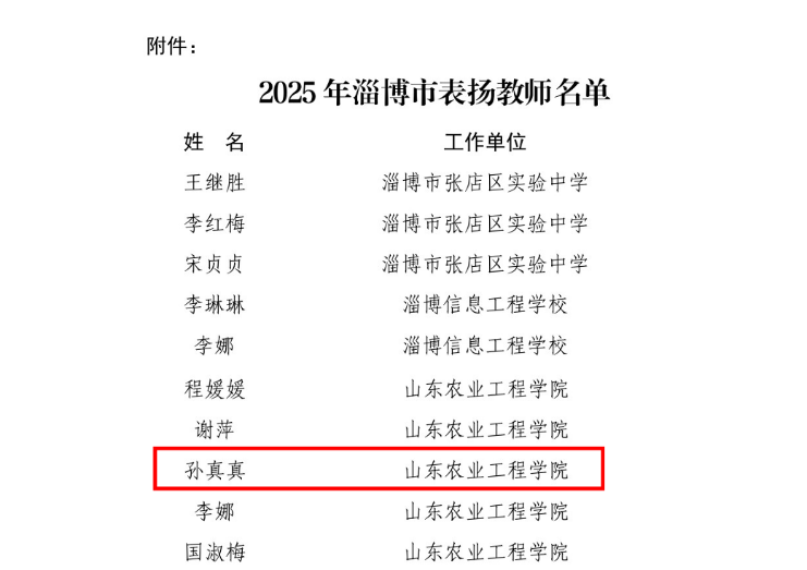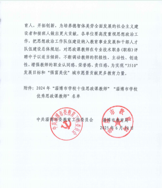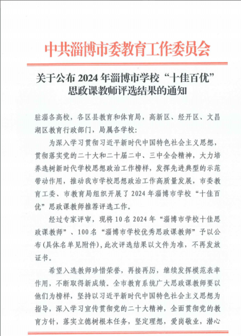 近年来,马克思主义学院高度重视教师队伍建设,取得了一定的成效。其中,我院姬志茹老师获评2024年“淄博市学校十佳思政课教师”称号,邢世政老师获评2024年“淄博市学校优秀思政课教师”称号,孙真真老师荣登2025年淄博市表扬教师名单。