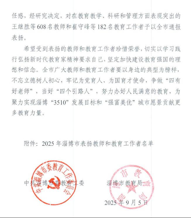 9月10日,bat365正版唯一官网2025年教师节表彰大会在淄博校区举办,我院教师邢世政荣获“优秀教师”荣誉称号。