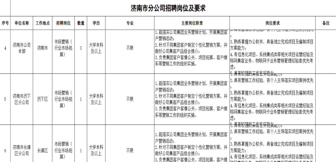 本次招聘涉及市、县公司软件开发、工程技术(含网络维护、前端运维、业务支撑、技术支撑、工程造价等)、规划设计、市场营销(含政企业务拓展、集客客户经理类岗位等)、节目编辑(网络中短剧制片人)、片区维护(客户经理)、营业客服、呼叫话务、财务管理(含会计)等9大类145个岗位。详见附件《招聘岗位及有关要求》。