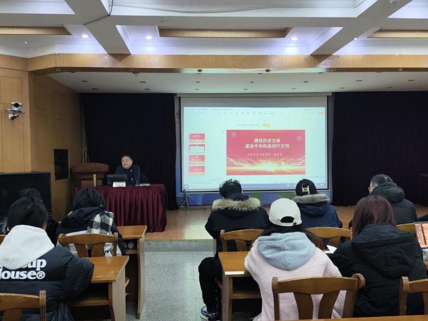 12月21日,校党委副书记张业赏以“赓续历史文脉建设中华民族现代文明”为题,在济南校区1号教学楼多功能厅,为人文学院2021级秘书学专业学生讲授了一堂生动的党课。