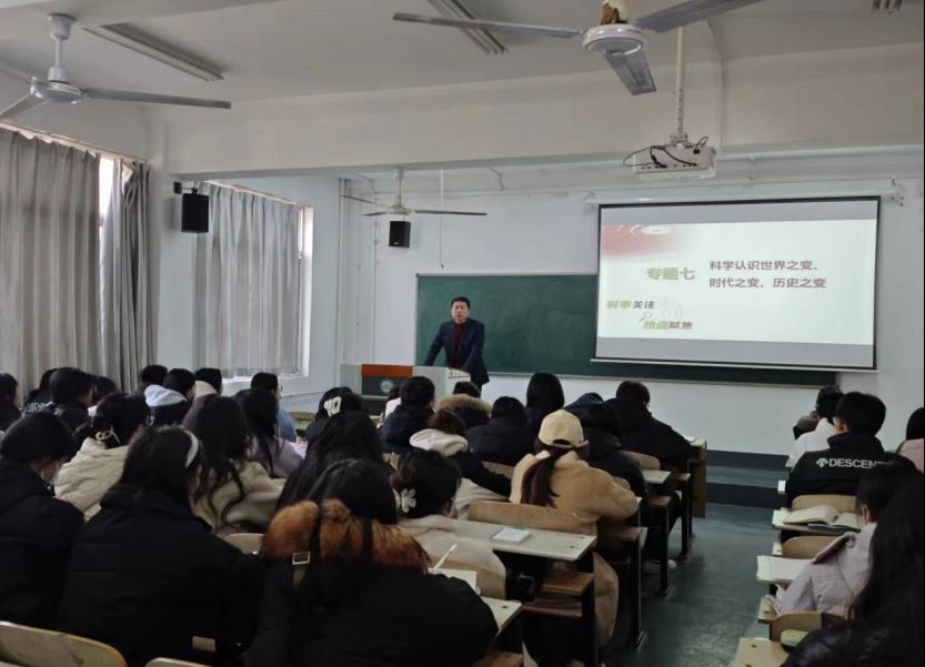 12月26日下午,校党委书记张鸿波以《科学认识世界之变、 时代之变、历史之变》为题,为人文学院2021级商务英语专业学生讲授形势与政策课。