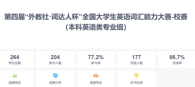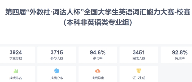 为持续推进外语智慧化教学不断深化,满足bat365学子在线英语深度学习的需求,提升学生英语学习兴趣和自主学习能力,4月18日,由我院承办、上海外语教育出版社提供技术支持的第四届“外教社•词达人杯”全国大学生英语词汇大赛--bat365正版唯一官网校赛成功举行。全校共计3919名同学参加了此次比赛。