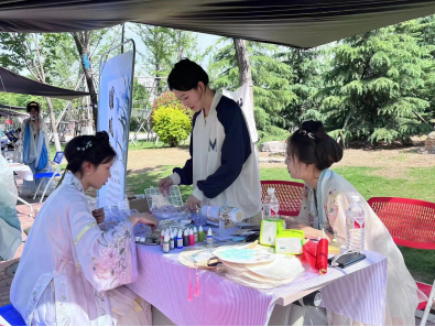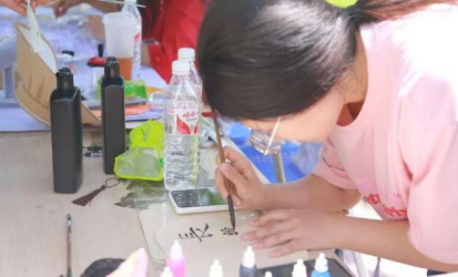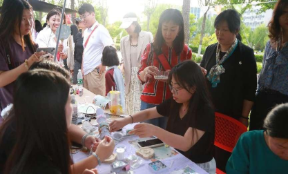 本次活动设置了多个非遗体验区,同学们亲自动手,尝试了“漆扇”、“拓染”、“国风DIY”等艺术活动:墨香氤氲的轻罗小扇在水拓漆的浸染下仿佛被赋予了自然的神韵。