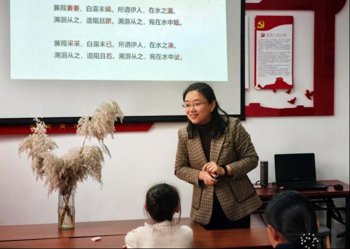 本次课堂以《诗经·秦风》中的经典篇章《蒹葭》为活动主题。首先,李秀娟老师通过视频、PPT展示和现场互动等多种生动的讲课方式,带领小朋友们认识了植物蒹葭及其价值,学习了《蒹葭》这首诗歌的意境与情感,领略了中国古典诗歌的魅力,带领大家学会以美学的眼光观察自然、感悟生活,把传统文化与鲜活的生活体验密切结合。