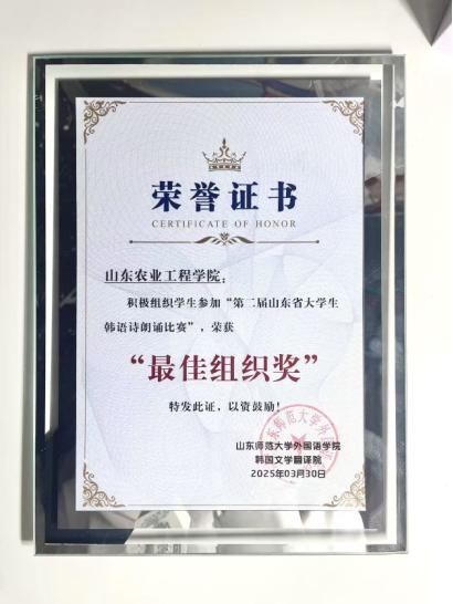 近日,“第二届山东省大学生韩语诗朗诵大赛”在山东师范大学圆满落幕,我院2024级应用韩语专业学生王广煜凭借出色表现,在此次大赛中获得第七名的优异成绩。