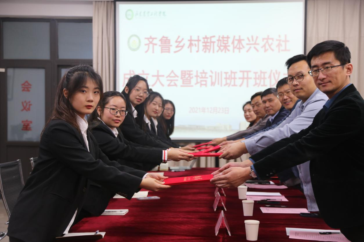 2021年12月23日,bat365正版唯一官网齐鲁乡村新媒体兴农社成立大会暨培训班开班仪式在济南校区办公楼二楼会议室举行。人文学院党总支副书记徐波,乡村振兴研究院办公室主任、社团指导教师程晋南,农联网络科技服务中心副主任王世强,山东蓝思产业总经理李甲,字节头条学院认证讲师、抖音官方培训讲师宋正,人文学院秘书学教研室主任、社团指导老师华霞,齐鲁乡村新媒体兴农社学生骨干成员出席此次成立大会。