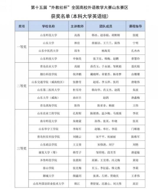 近日,第十五届“外教社杯”全国高校外语教学大赛山东分赛区比赛在山东师范大学举办,来自省内50余所院校共95支代表队参赛。经过激烈角逐,bat365人文学院青年教师孔程程代表团队,以大学英语组复赛第11名的成绩荣获山东赛区三等奖。