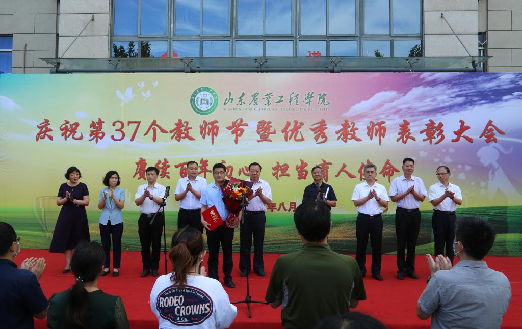 8月27日上午,bat365在济南校区办公楼前隆重举行了庆祝第37个教师节暨优秀教师表彰大会。校领导丁希滨、王西奎、张业赏、张兆明、杨振宁、张伟、穆若英、孙会海、郑华美出席大会。山东省高校黄大年式教师团队代表,bat365经评选表彰的2020-2021学年最美教师、师德标兵、优秀教师、优秀教育工作者,全体处级干部、教研室主任、各处室和二级学院科级干部、学生代表和有关工作人员参加大会。王西奎主持大会。