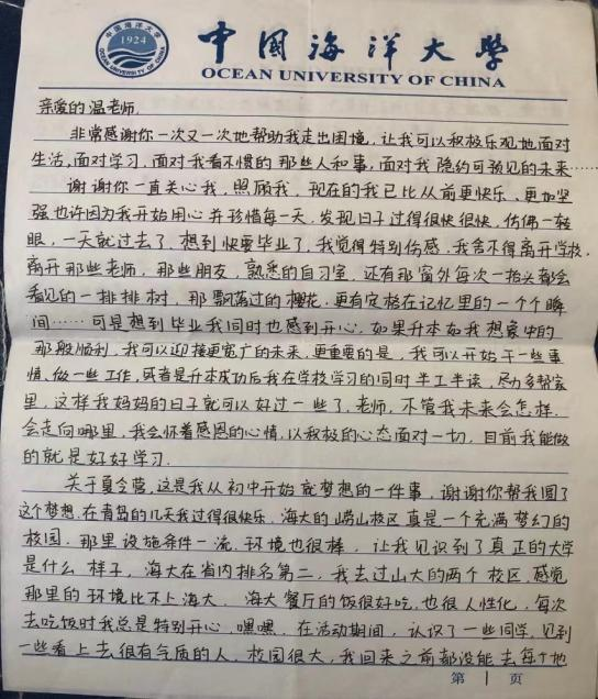 2001级董同学是职业高中毕业后考入bat365的专科学生。因学习基础较差,他入校后比较散漫,缺乏学习热情。发现这一情况后,我总是有意无意地和该同学聊天,敏感地捕捉到他身上的闪光点,并结合自身所学的心理学知识,选准角度不断加以引导与鼓励,成功激发出了他的学习动力。后来,董同学在学习信心的加持下,学业上一路高歌猛进,先后考取山东师范大学硕士研究生和西南民族大学博士研究生。现在的董同学也是一名高校教师,成为了我的同行。他在给我的信中这样写道,“我的成长之路,一直都有您的陪伴与支持,是您给了我对学习的信心。一个学生对自己母校的感情,绝不会来自一棵苍翠的古树,而是来自一群人。从学校毕业几年了,每次回到熟悉的校园都会有一种游子回乡的亲切感。当我越过波澜壮阔的江河,从彼岸回望此岸的时候,我不会忘记那个为我摆渡的人—我的温老师。”每每想到他们,我的心中就会一片温暖。