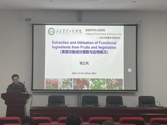 2024年11月28日,我院杨立风副教授在淄博校区理工西楼B103为我院师生作了题为“果蔬功能成分提取与应用概况”的学术报告。