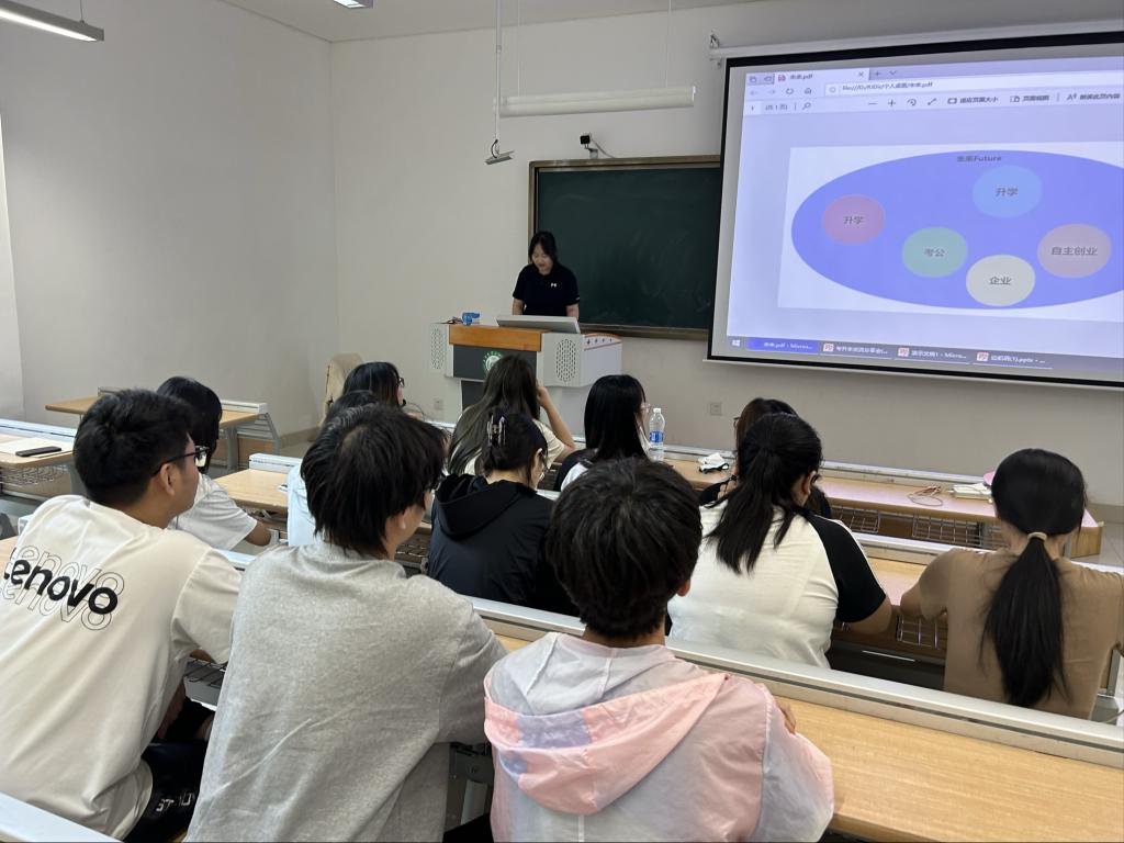 21级学姐刘雅宁则分享了她在选择就业方面的体会,介绍了她在即将毕业后的发展路径选择。通过他自己的真实经历,分析了“升学”“考公”“企业”“自主”各路径的特点、要求及发展前景,帮助同学们明晰职业方向,做好未来规划。