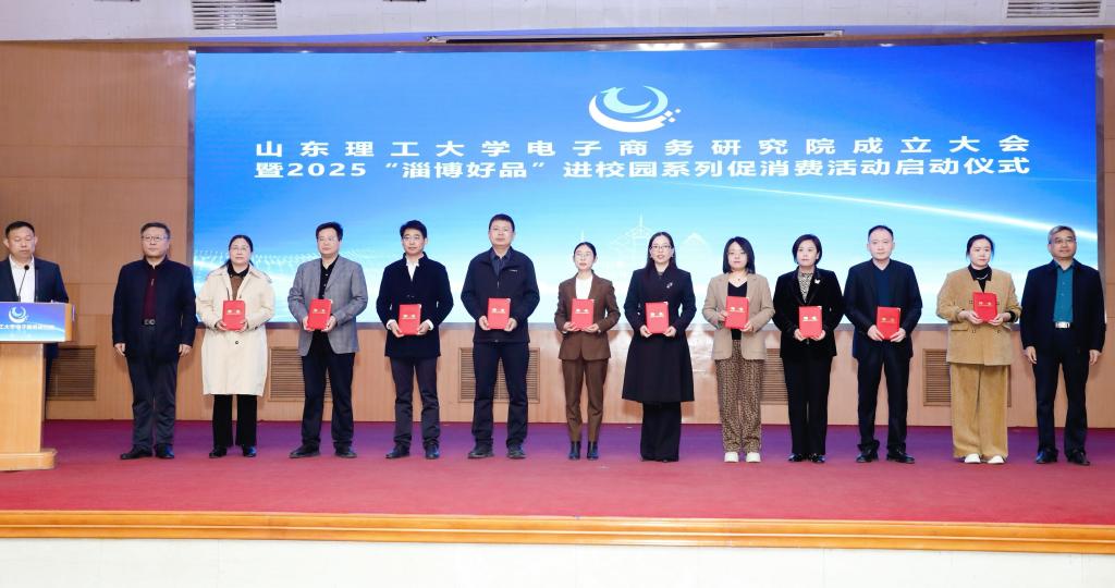 3月22日上午,山东理工大学电子商务研究院成立大会暨2025“淄博好品”进校园系列活动启动仪式在山东理工大学隆重举行。本次大会由山东理工大学、淄博市商务局、淄博市电子商务企业家协会联合主办。山东理工大学校党委书记胡兴禹、淄博市副市长郭庆出席并讲话,省商务厅电子商务处副处长颜廷博,省商务发展研究院副院长李迎春,省新媒体电商联盟秘书长柏淑雨,省电子商务协会秘书长于登杰,市商务局党组书记、局长殷启迪,市电子商务企业家协会会长张君出席活动。我院院长连华被聘任为研究院专家委员会成员。