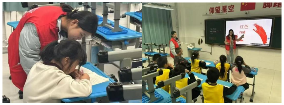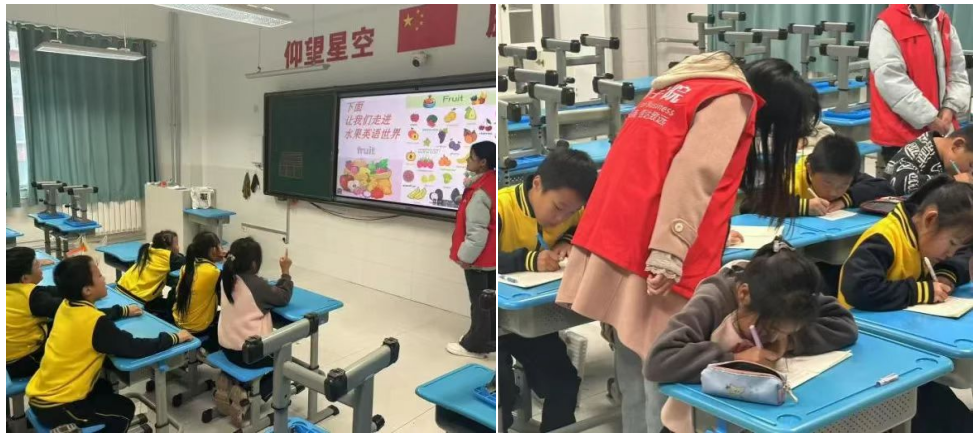 志愿者们引导孩子们学习了一些基础的英语单词,如颜色、数字和家庭成员等。通过图片、实物和简单的对话练习,并鼓励他们大胆开口,增强了孩子们的自信心。