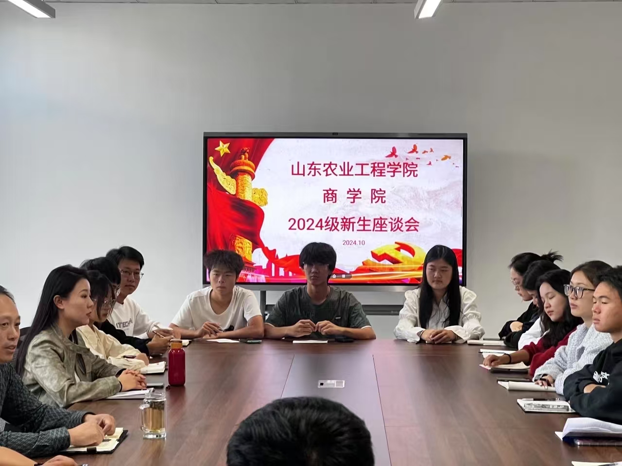 为了更好的促进商学院2024级新生适应大学生活,明确学习目标,规划未来发展。商学院于2024年10月12日在文法西楼B303召开2024级新生座谈会。商学院党总支书记李欣、党总支副书记王世辉,24级辅导员老师王浸皓、姬雅婷、于志翔以及2024级新生代表参加本次座谈会。