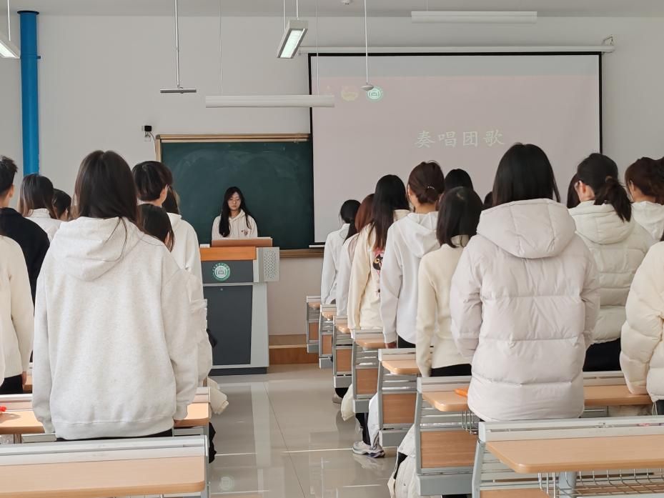本次入团仪式由23级财务管理专业的孙玮主持。仪式在庄严的国歌声中拉开帷幕,全体起立,奏唱国歌,激昂的旋律回荡在教室,点燃了在场每一个人的爱国热情。大家目光专注,歌声洪亮,向祖国表达敬意,营造出庄重氛围。