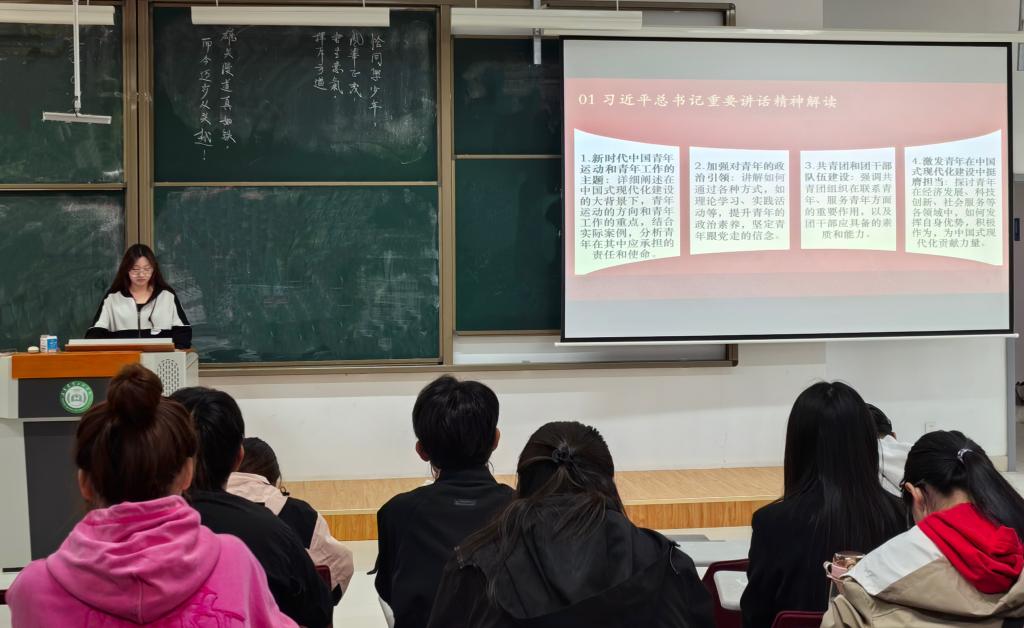 在主题讲座环节,主持人对习近平总书记重要讲话精神进行了深入解读。从新时代中国青年运动和青年工作主题出发,结合实际案例,阐述青年在中国式现代化建设中的责任使命;深入剖析加强青年政治引领的方式方法,助力青年提升政治素养;同时强调共青团和团干部队伍在联系、服务青年方面的重要作用。此外,详细解读了激发青年在各领域挺膺担当的路径,鼓励青年积极投身经济发展、科技创新、社会服务等工作,为中国式现代化建设贡献力量。