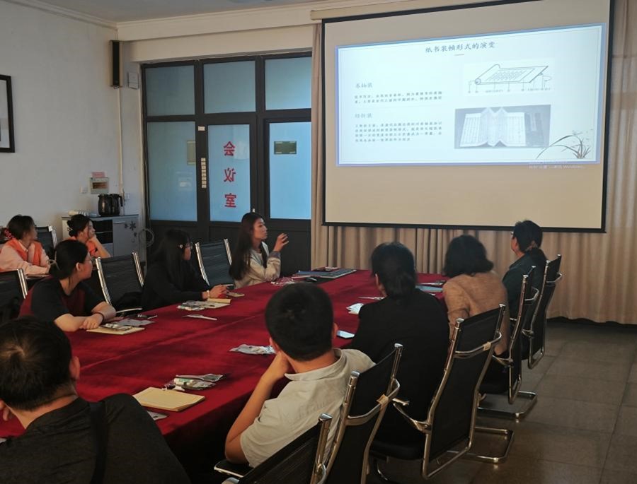 在讲师的讲解中,师生们深入了解卷轴装、旋风装、经折装、梵夹装、蝴蝶装、包背装、线装等纸书装帧形式的演变。