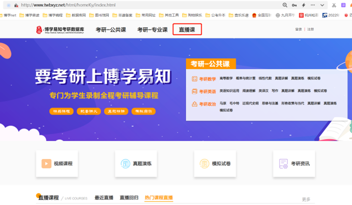 1.登录图书馆网站——点击数字资源/电子资源——点击“博学易知考研数据库”,进入考研库首页。或浏览器输入www.twbxyz.net/html/homeKy/进入考研库首页