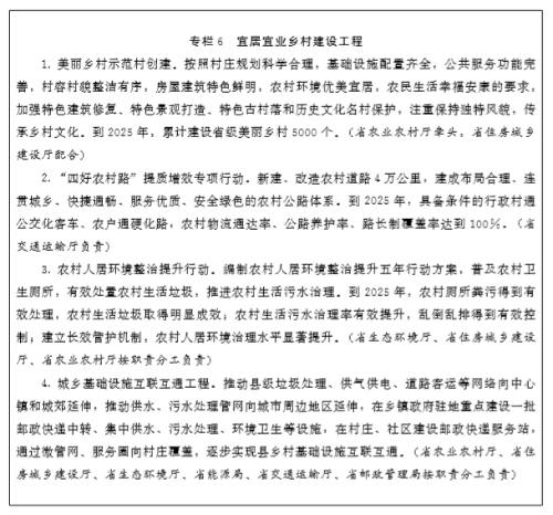 1.加强乡村基础设施建设。推动城乡基础设施统一规划、统一建设、统一管护,构建分级分类投入机制。统筹布局道路、供水、雨水、供电、农村生活污水治理和垃圾处理等设施,建立健全农村基础设施运行维护机制,落实运行维护费用来源。统筹规划重要市政公用设施,向城市近郊和规模较大中心镇延伸。统筹城乡路网规划建设,畅通城乡交通运输连接。推动农村千兆光网、第五代移动通信(5G)、移动物联网与城市同步规划建设。深入开展美丽乡村示范创建,坚持“省、市、县”三级联创,“点、片、面”统筹推进,到2025年,累计建设省级美丽乡村5000个。(省发展改革委、省财政厅、省住房城乡建设厅、省生态环境厅、省交通运输厅、省水利厅、省能源局、省通信管理局、省农业农村厅按职责分工负责)