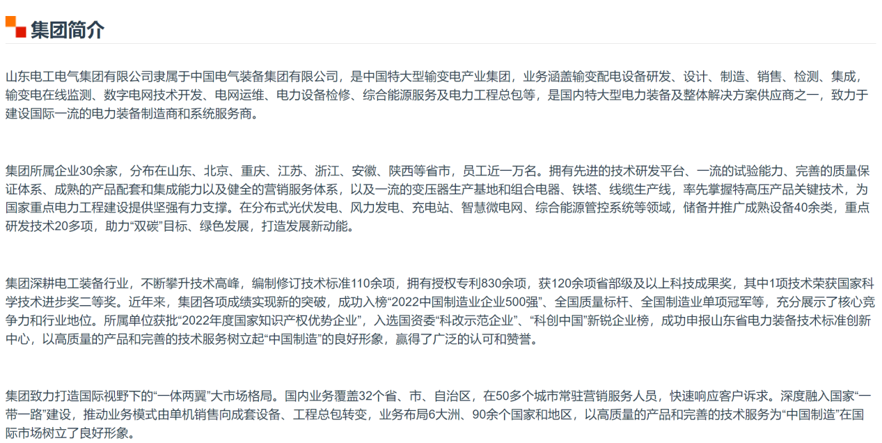 山东电工电气集团有限公司隶属于中国电气装备集团有限公司,是中国特大型输变电产业集团,业务涵盖输变配电设备研发、设计、制造、销售、检测、集成,输变电在线监测、数字电网技术开发、电网运维、电力设备检修、综合能源服务及电力工程总包等,是国内特大型电力装备及整体解决方案供应商之一,致力于建设国际一流的电力装备制造商和系统服务商。