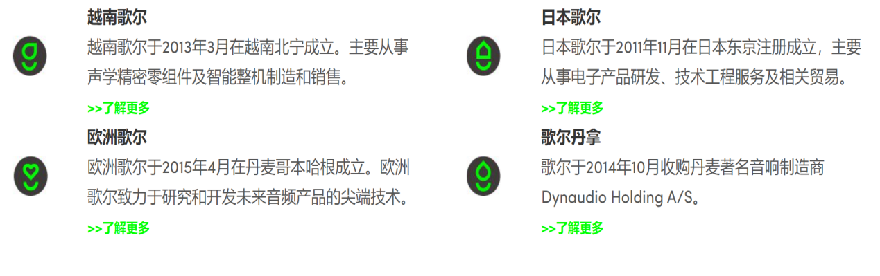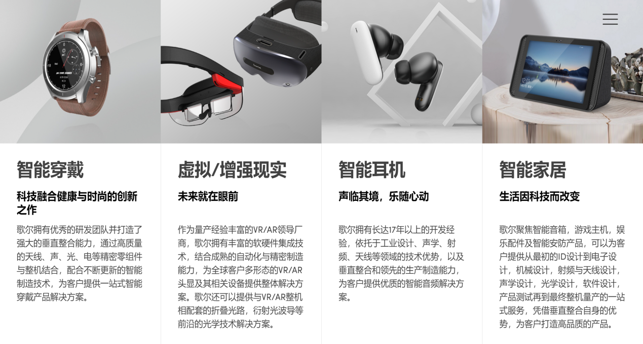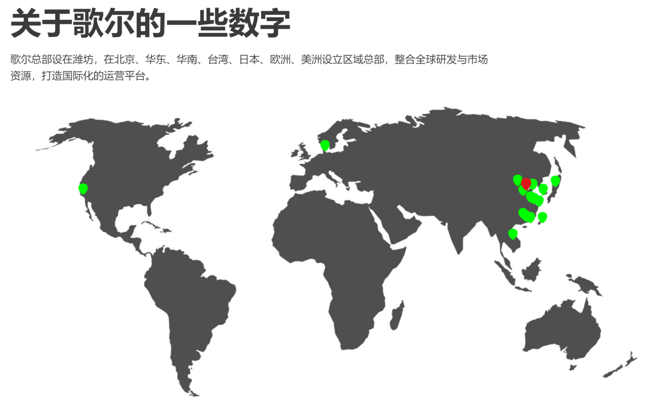 目前歌尔已在中国、美国、日本、韩国、丹麦等全球6个国家21个城市布局,以声光电为主要技术方向,通过集成跨领域技术提供系统化整体解决方案。
