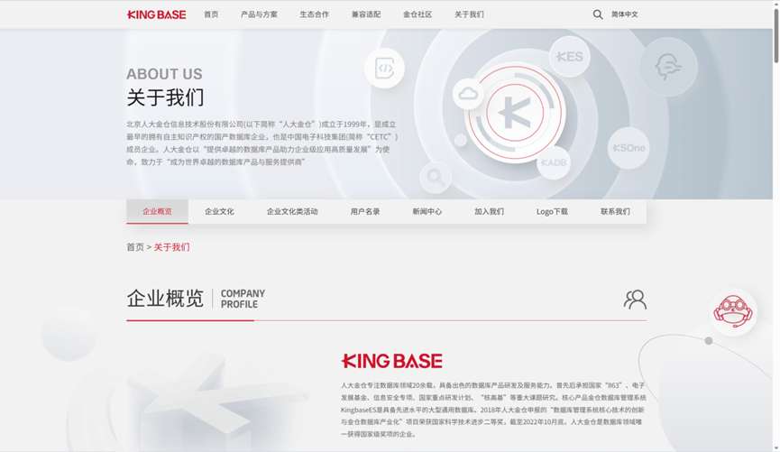 北京人大金仓信息技术股份有限公司(简称:人大金仓)是中国自主研发数据库产品和数据管理解决方案的领导企业,由中国人民大学及一批最早在国内开展数据库教学、研究与开发的专家于1999年发起创立。2008年,成功获得中国电子科技集团(CETC)战略注资,被纳入CETC集团的整体发展战略。我们长期致力于研发和推广具有自主知识产权的国产数据库管理系统。自成立以来,依托中国人民大学数据与知识工程研究所在数据库技术领域长期教学科研的深厚积累,被认定为北京软件产业基地人大金仓数据库产业化中心、教育部数据库与商务智能工程研究中心和中关村科技园区百家创新试点企业。人大金仓全面推行ISO9001质量管理体系,并通过了软件能力成熟度CMM2级评估,为公司开发高水平高质量的大型系统软件产品、向用户提供优质满意的服务,提供了制度和能力上的保证。人大金仓成功承担了国家十五“863”数据库重大专项课题“通用数据库管理系统KingbaseES研发及其应用”和北京市科技计划重大项目“大型通用数据库管理系统研制”等重大数据库项目研发任务。金仓数据库KingbaseES是入选国家自主创新产品目录的唯一数据库产品,同时还入选了北京市和中关村科技园区自主创新产品目录。产品稳定运行于Windows、Linux、麒麟以及UNIX等主流操作系统平台,并与国内主要操作系统和中间件厂商进行产品兼容性认证,曾获北京市科学技术奖一等奖和工信部软件与集成电路促进中心(CSIP)颁发的“国产优秀基础软件平台”。金仓数据库KingbaseES获得公安部颁发的计算机信息系统安全专用产品销售许可证,产品安全级别达到《GB/T 20273-2006信息安全技术 数据库管理系统安全技术要求》第三级。目前,金仓数据库KingbaseES在政府、军队、电力、农业、水利、质检、教育、金融、能源、制造业信息化等领域拥有一大批实际的成功应用案例,众多应用已稳定运行5年以上。在中共中央组织部的全国组织系统信息化、国家电网、新华保险信息化建设和北京市及下属30多个委办局和区县的电子政务应用中,金仓数据库KingbaseES都发挥了重要支撑作用。在质监行业中,人大金仓是唯一入选国家金质工程的国产数据库厂商,在审计行业,人大金仓入选了金审工程二期。人大金仓是国家核高基重大专项数据库方向课题的牵头承担单位。