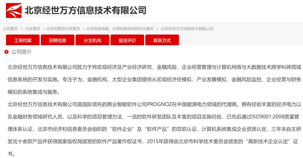 北京经世万方信息技术有限公司是一家集经济产业研究建模、行业解决方案设计、自主软件产品研发、数据及信息资源整合、应用系统开发与集成等跨领域业务于一体的综合型高科技公司,致力于为政府部门、大型企业集团、金融机构提供经济产业发展预测、企业经营与财务仿真、金融风险监控等方面的信息化解决方案。公司拥有经验丰富的能源、经济、金融领域的研究人员,一流的技术研发团队,以及科学的项目管理方法和丰富的项目实施经验。公司已先后通过ISO9001质量管理体系认证、ISO14001环境管理体系认证、ISO27001信息安全管理体系认证、CMMI三级认证、双软认证、计算机系统集成三级资质认定,中关村高新技术企业认定,国家高新技术企业认定。
