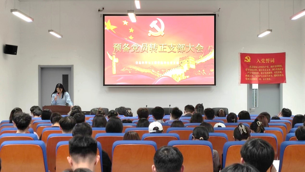 2023年6月9日12时,信息科学与工程学院于理工东楼A101召开预备党员转正支部大会。会议由信息科学与工程学院学生党支部书记刁丽娜主持,信息科学与工程学院党总支副书记孙向群,教师夏天宇、赵丛楠、赵晓芳、孙兆柱,以及支部全体党员、预备党员共同参加。