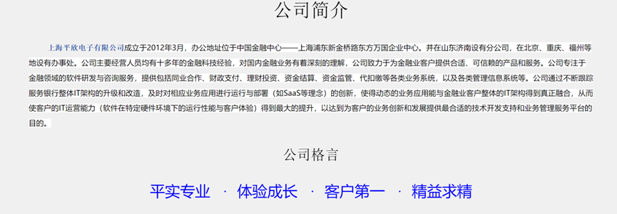 上海平欣电子有限公司成立于2012年3月,办公地址位于中国金融中心——上海浦东新金桥路东方万国企业中心。并在山东济南设有分公司,在北京、重庆、福州等地设有办事处。公司主要经营人员均有十多年的金融科技经验,对国内金融业务有着深刻的理解,公司致力于为金融业客户提供合适、可信赖的产品和服务。公司专注于金融领域的软件研发与咨询服务,提供包括同业合作、财政支付、理财投资、资金结算、资金监管、代扣缴等各类业务系统,以及各类管理信息系统等。公司通过不断跟踪服务银行整体IT架构的升级和改造,及时对相应业务应用进行运行与部署(如SaaS等理念)的创新,使得动态的业务应用能与金融业客户整体的IT架构得到真正融合,从而使客户的IT运营能力(软件在特定硬件环境下的运行性能与客户体验)得到最大的提升,以达到为客户的业务创新和发展提供最合适的技术开发支持和业务管理服务平台的目的。