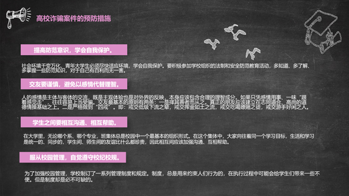 辅导员们讲道,大学是一个充满青春活力和无限可能的地方,同时也是各种信息和诱惑交织的复杂环境。在这里,我们不仅要学习专业知识,还要学会如何保护自己,避免受到外界的侵害。同时,信工学院也将采用定期开展反诈骗主题班会、安全辅导员走访宿舍等形式帮助学生进行安全检查,整改并消除宿舍用电,完善宿舍安全管理制度。