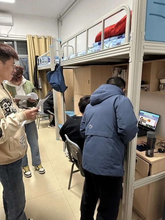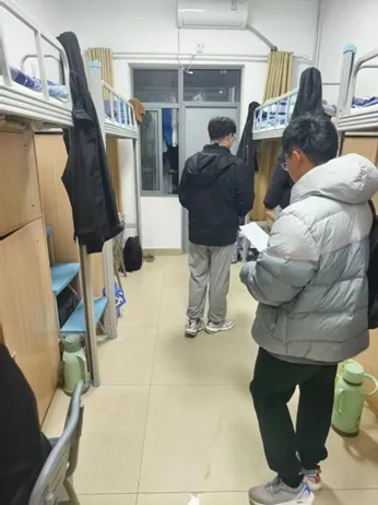 检查过程中,领导一行首先来到了男生宿舍区。他们走进每一间宿舍,认真查看了宿舍的卫生状况,包括床铺整洁度、地面清洁度、物品摆放情况等。同时,他们还与学生进行了亲切的交流,询问了同学们在生活中的困难和需求,鼓励大家要养成良好的卫生习惯,共同维护宿舍的整洁和卫生。