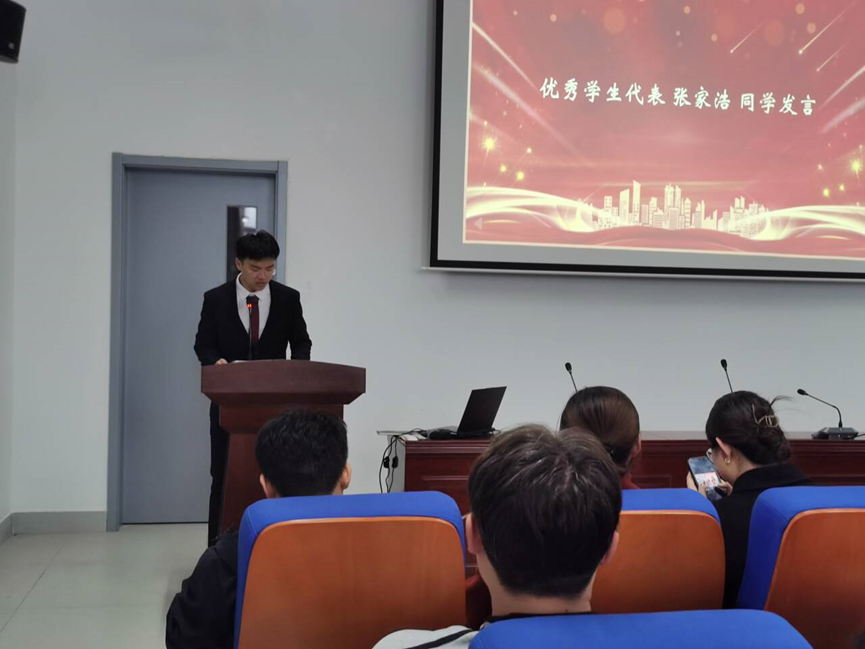 紧接着,优秀学生代表张家浩同学,优秀学生干部代表王靖文同学以及先进班集体代表杨淀皓同学代表优秀同学们发言,他们分享了自己的学习经历和成长故事,其中作为优秀学生代表发言的张家浩同学,他不仅学习成绩优异,还是信工学院学生会主席,他向大家讲述了他是如何做到学习和工作两不误,怎样提高效率做好每一件事,鼓励同学们要有梦想,更要有为梦想坚持不懈的勇气和毅力。