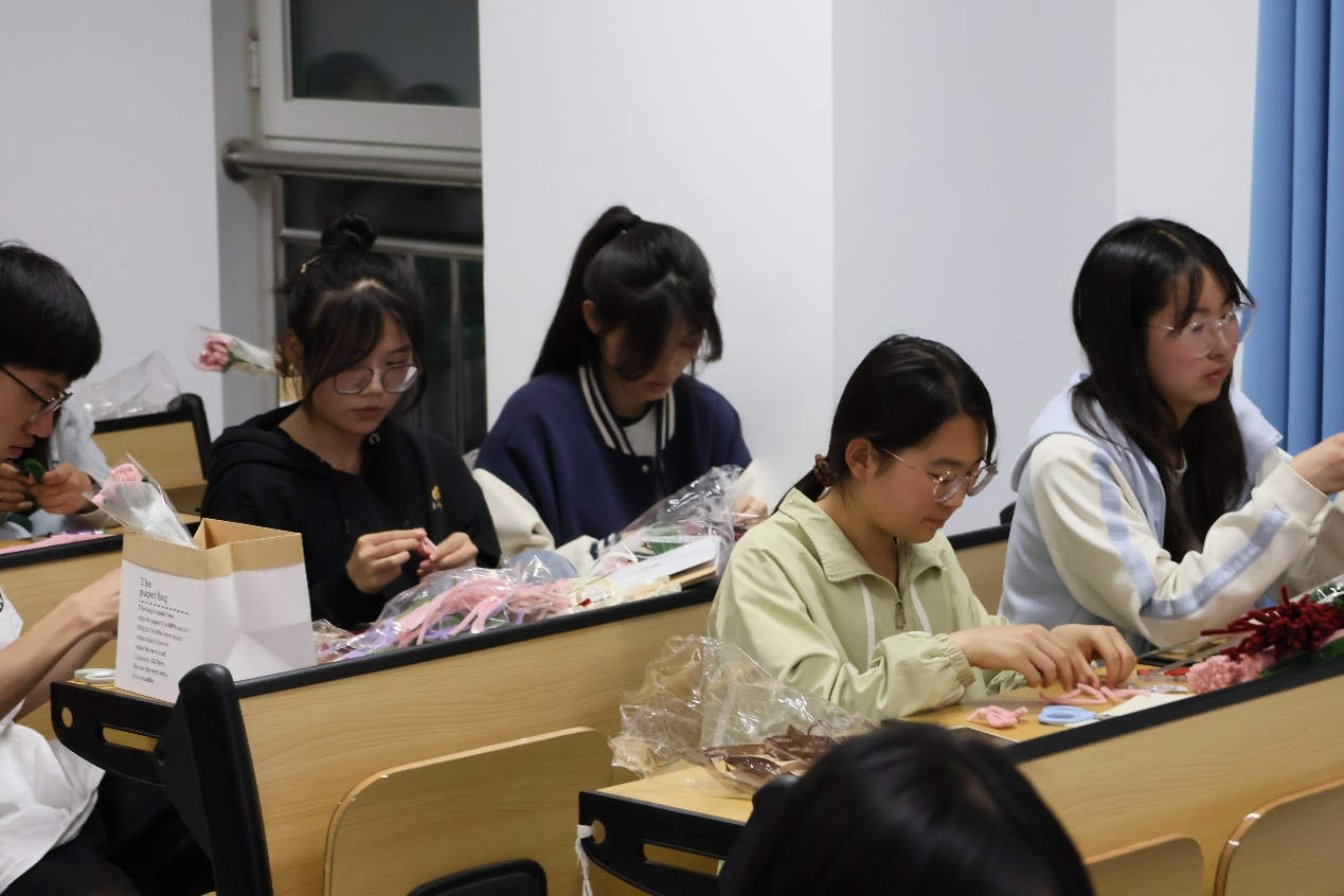 活动现场,信息科学与工程学院老师和学生会负责人耐心指导志愿者如何制作花束。志愿者认真学习并充分发挥想象力,用五颜六色的扭扭棒,根据花束的形状、颜色以及大小进行调整、缠绕和粘贴,制作出一束束精致而美丽的花束。