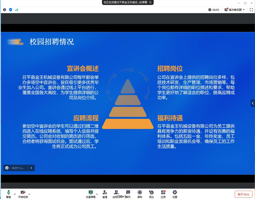 宣讲会采用线上直播的形式,通过先进的视频会议平台,实现了企业与学院师生的实时互动。会上,公司高层领导详细介绍了公司的发展历程、企业文化、业务范围以及未来发展规划。他们强调,公司始终秉承“创新、务实、高效、共赢”的企业精神,致力于为客户提供高品质、高效率的机械设备解决方案。