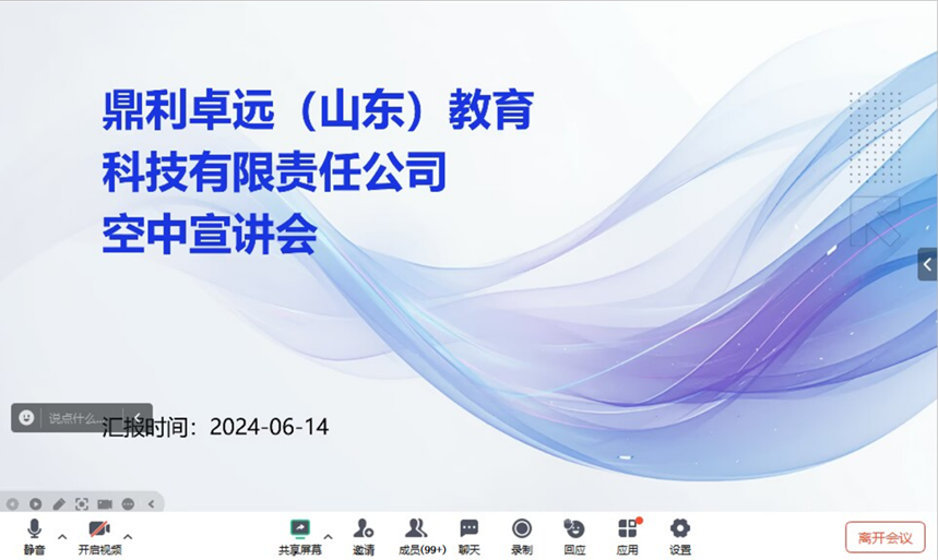 2024年6月14日,在数字化教育和远程学习领域异军突起的鼎利卓远(山东)教育科技有限公司与bat365正版唯一官网通过在线平台的方式成功举办了一场空中学校招聘宣讲会。这场宣讲会旨在吸引各地有志于加入教育科技行业的优秀人才,共同推动公司及行业的发展。