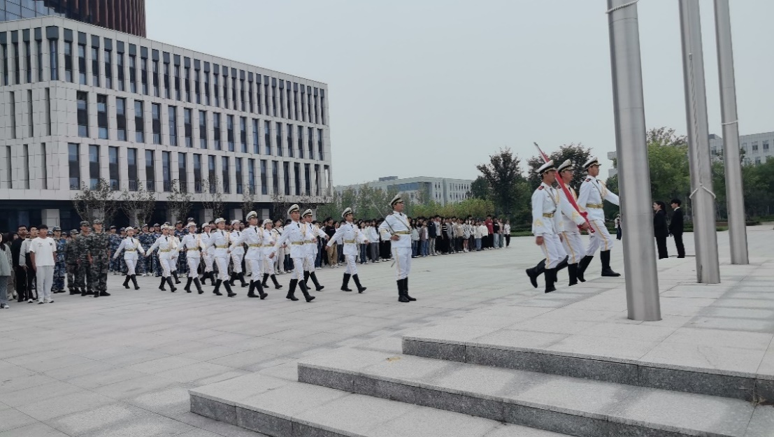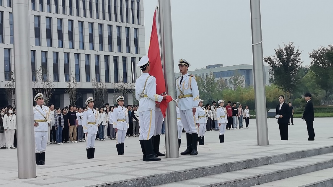 晨光初破晓,国旗护卫队迈着铿将有力的步伐护送鲜红的五星红旗。擎旗手迎风振臂,奋力将国旗挥向空中展开。嘹亮的《义勇军进行曲》响起,全体师生高唱国歌,向冉冉升起的五星红旗行注目礼,向革命先烈和人民英雄庄严致敬,为伟大祖国献上深情祝福。
